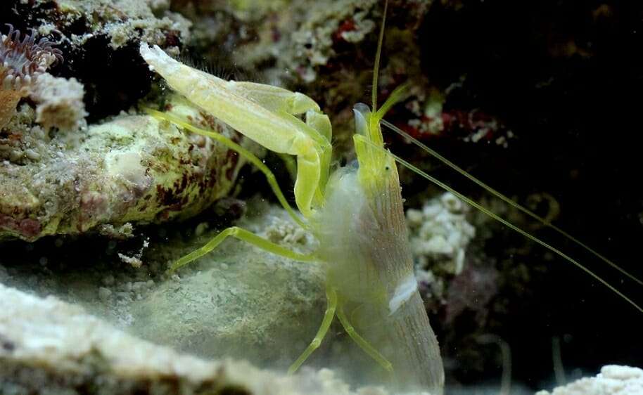Der rund 4 Zentimeter lange, nahezu durchsichtige Pistolenkrebs, oder oder auch Knallkrebs, stammt eigentlich aus der Familie der Garnelen.